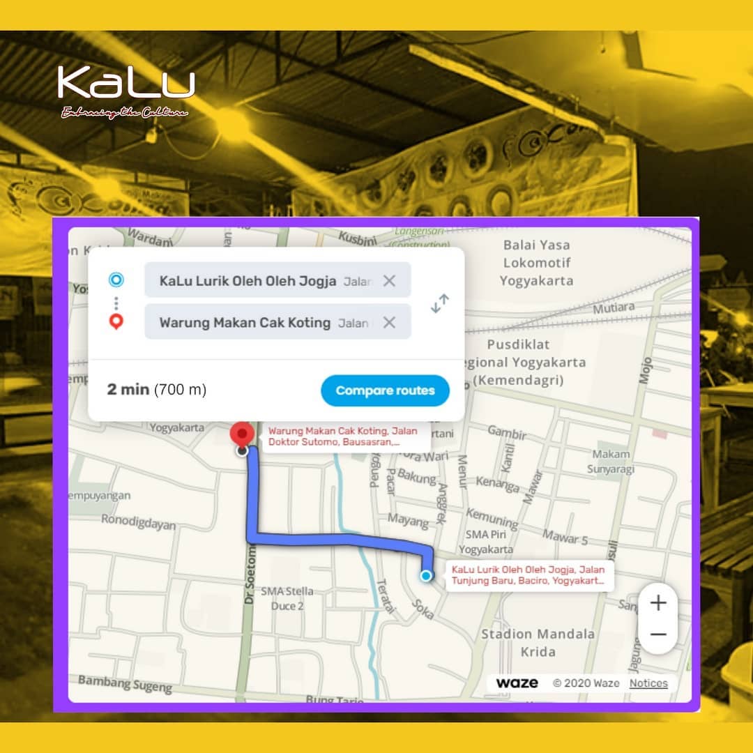 Yogyakarta merupakan kota dengan makanan khas Gudeg. Gudeg ini terbuat dari nangka muda yang dimasak secara tradisional dengan menggunakan bumbu yang khas dengan rasa yang cenderung manis. Gudeg biasa dimakan dengan sambal tempe dan rambak dengan lauk ayam kampung atau telur. Selain gudeg, Jogja juga memiliki banyak kuliner yang enak, salah satunya adalah Ayam & Bebek Goreng Cak Koting. Bagi para pecinta menu ayam & bebek goreng ini bisa menjadi pilihan yang tepat, dengan penyajian yang ditambah dengan kremesan, samabl, dan terancam yang segar. Lokasi bebek Cak Koting ini tidak jauh dari Stasiun Lempuyangan. Setelah kenyang makan, untuk mencari oleh-oleh souvenir yang dekat dengan Cak Koting adalah KaLu. KaLu ini terletak ditengah kota Jogja dengan menyediakan berbagai macam souvenir yang unik dan etnik. #TemanKaLu bisa search di Gmaps KaLu Lurik Oleh-Oleh Jogja untuk detail alamatnya. KaLu buka setiap hari pukul 09.00-17.00.